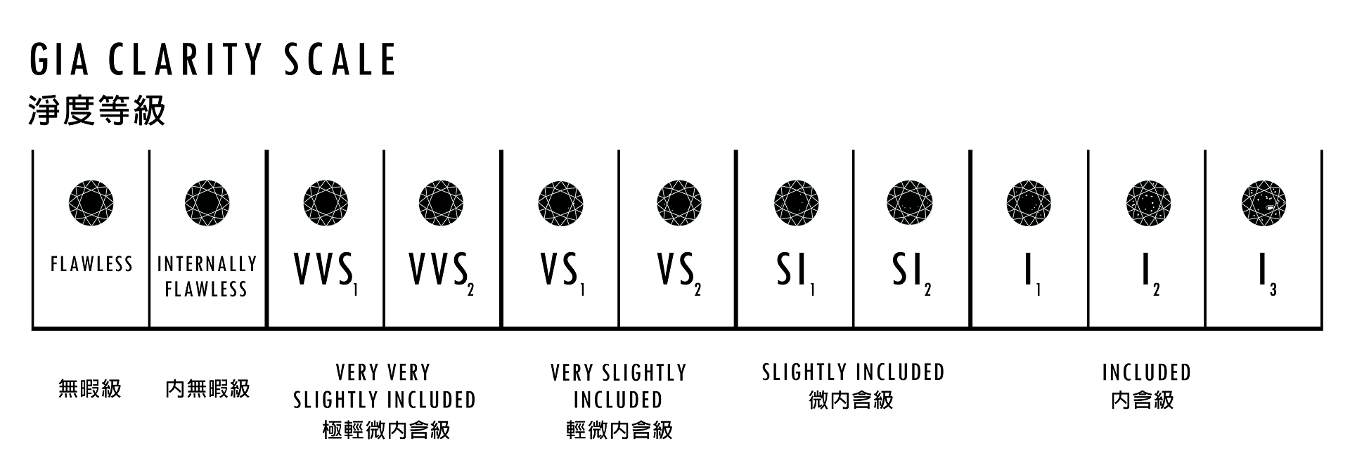 淨度以 10 倍放大檢視,從 FL 到 I3 共 11 級,依內含物大小、位置與可見度分級。