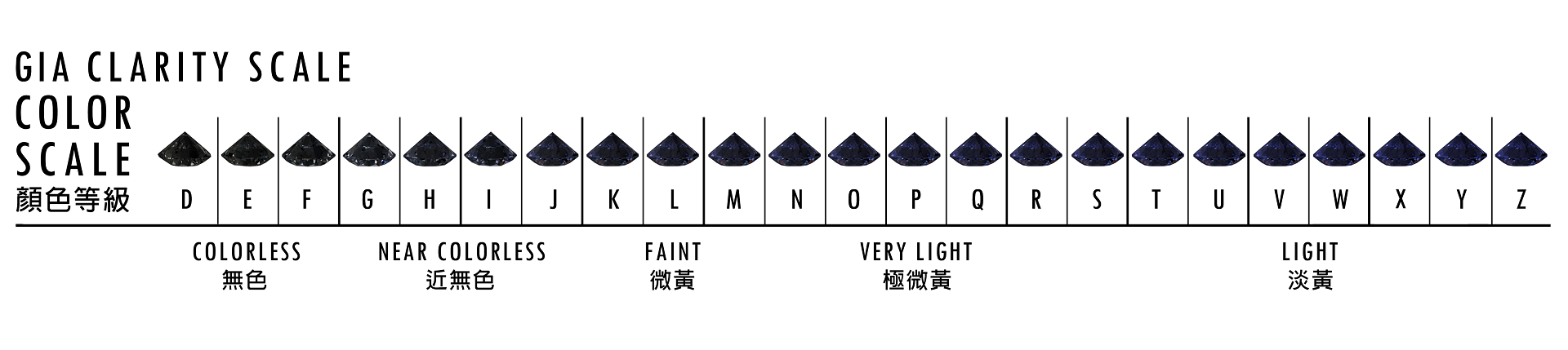 GIA 以 D-Z 作為白鑽顏色分級,越接近無色等級越高;超過 Z 則歸為彩鑽範疇。