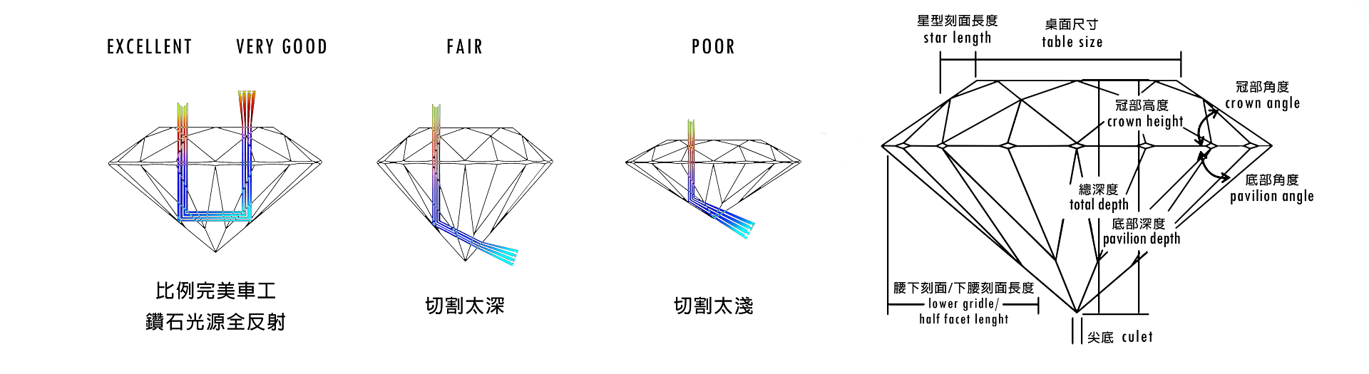 切工是影響火光與亮度的關鍵人為因素,GIA 依整體比例、對稱與拋光等條件評估至 Excellent 到 Poor。