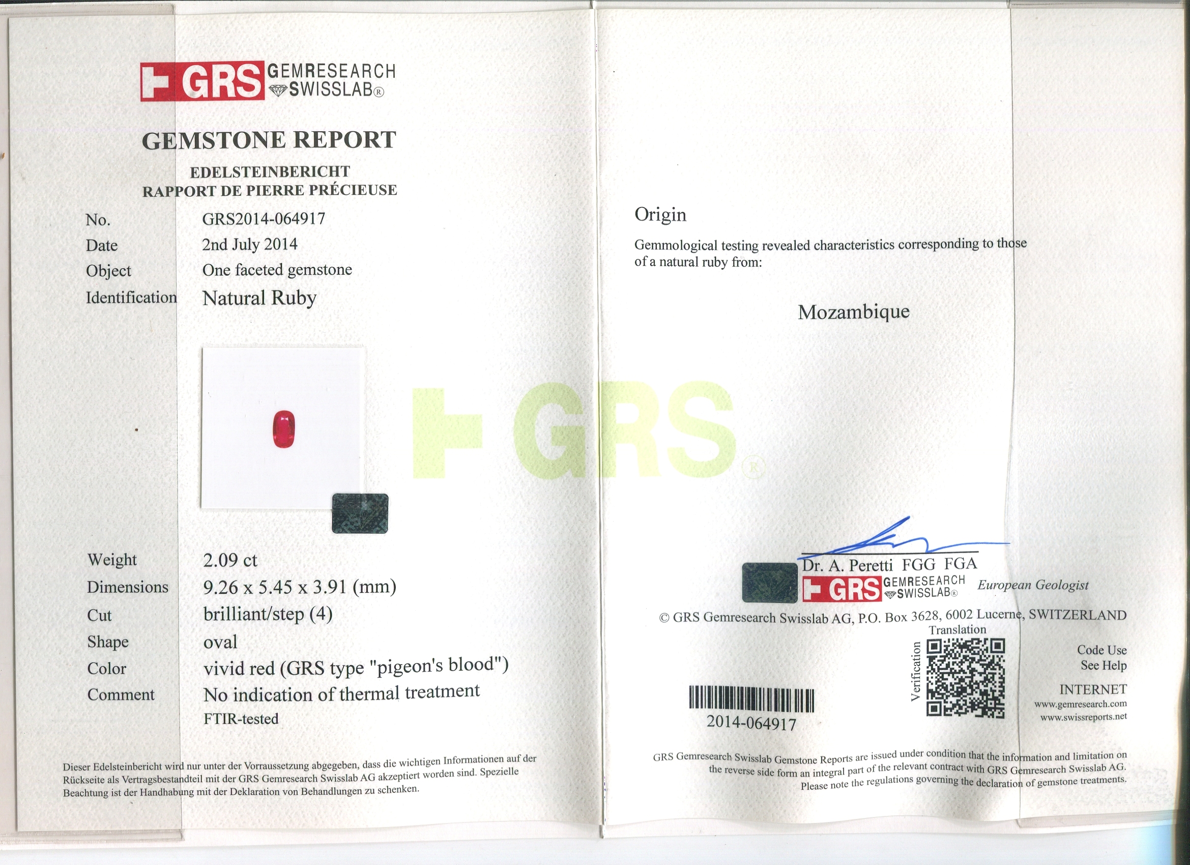 • 主石證書:瑞士GRS鑑定證書